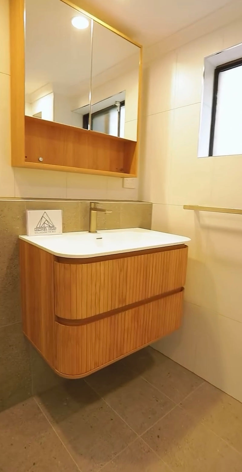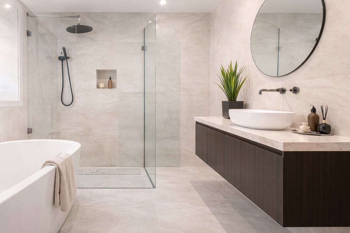 A refined bathroom renovation featuring custom cabinetry, premium fixtures, and a calm, modern finish.